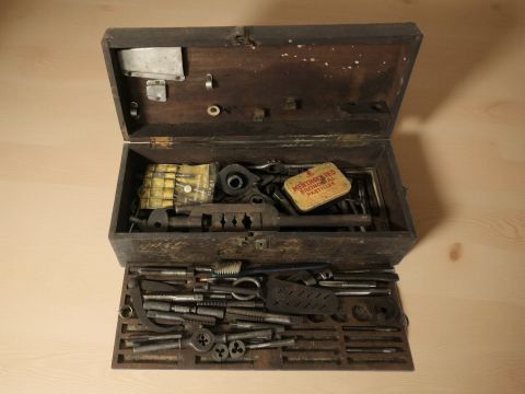 An antique tap and die set, in wooden box.