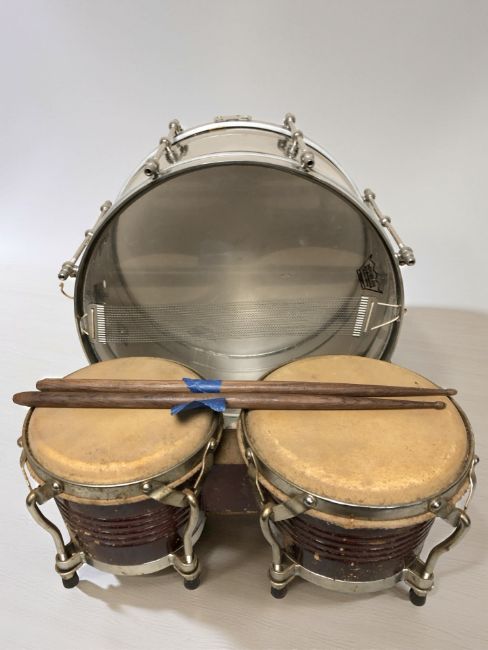 A Weather King drum, a further pair of hide covered drums and a pair of drum sticks.