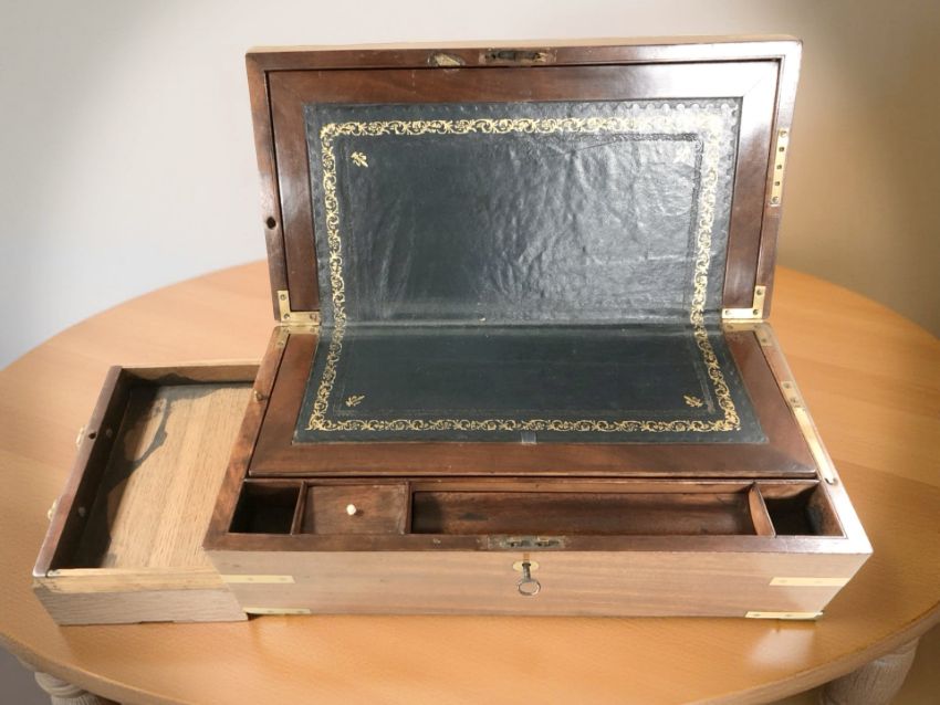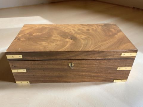 A mahogany and brass campaign writing slope, width 46 cm, fitted with a secret drawer with key.