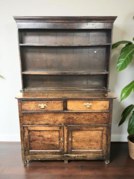 A George II provincial elm dresser, mid-18th century, with three tier plate rack above a rounded-rectangular lower cabinet, fitted with two drawers and cupboard doors with brass pull handles, 122 cm x 50 cm x 175 cm