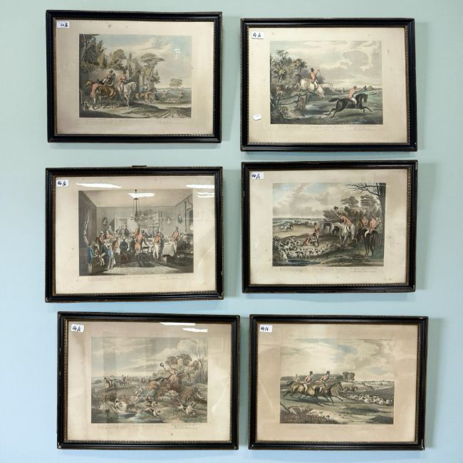 After Francis Calcraft Turner (British, 1795-1846) : Bachelor's Hall Plates 1 -6 - The full set of six hunting prints, aquatints with hand colouring, each with full margins, 31 cm x 38 cm, framed as a set in Hogarth-style frames. (6)