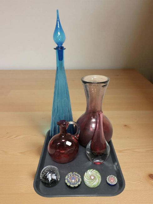 A Caithness Cauldron Sable glass paperweight, a further Scottish Perthshire paperweight, two millefiore paperweights, together with modern cranberry glass items and a large blue glass decanter with stopper.