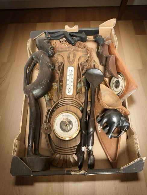 A group of African treen carvings, continental barometers, etc. (1 box)