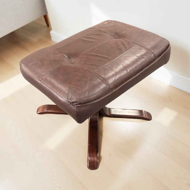 A Scandinavian stained bentwood burgundy leather food stool.