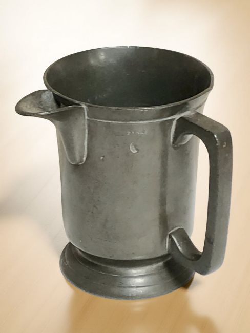 A pewter tankard with spout engraved 'Red Lion Hotel', height 13 cm.