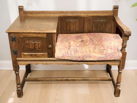 An oak linen fold telephone seat, 97 cm x 48 cm x 76 cm