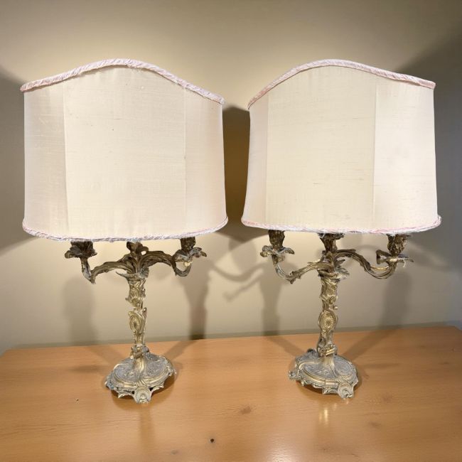 A pair of early 20th century gilt metal three sconce table lamps, with shades, height 75 cm.