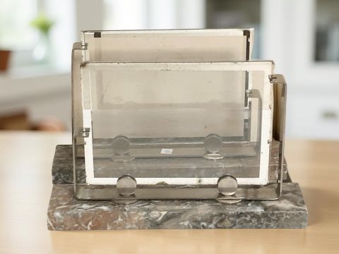 A pair of chrome and marble Art Deco picture frames, width 26 cm