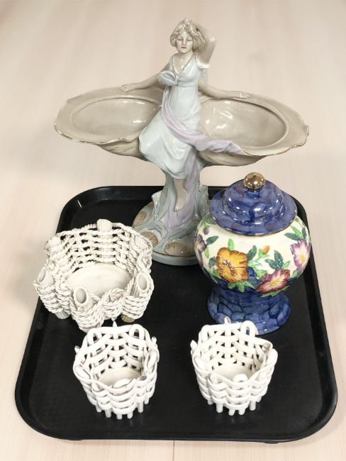 A Royal Dux centrepiece in the form of two ladies within an oyster shell (restored), together with three lattice work ceramic baskets and Maling lustre jar with cover