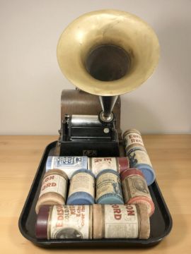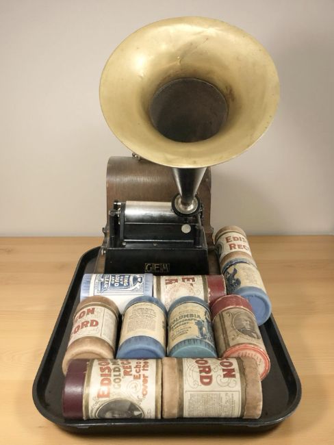 An Edison Gem Phonograph in oak case with horn and quantity of cylinders