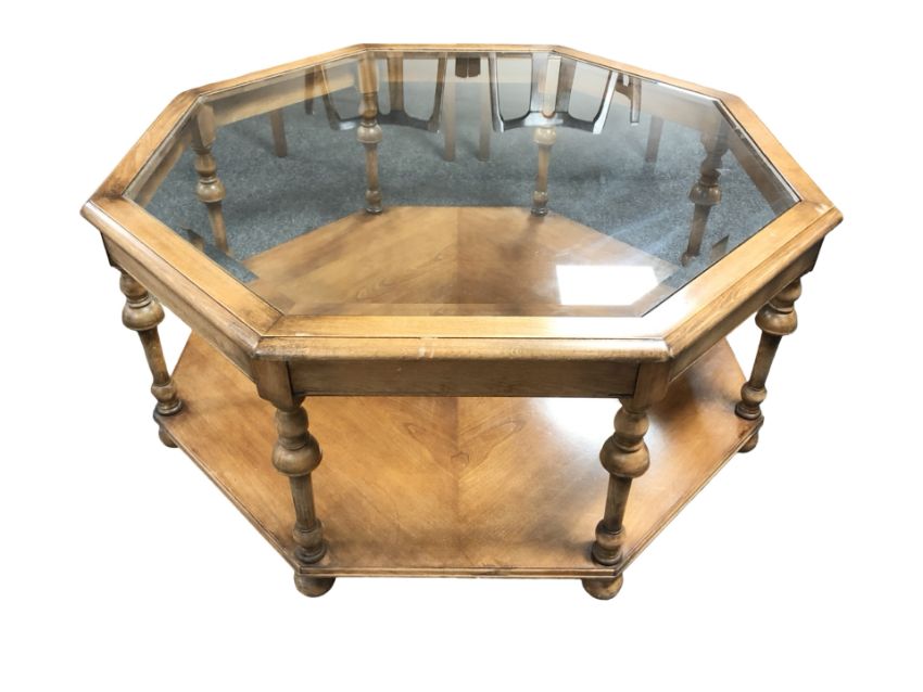 A reproduction octagonal two tier coffee table with bevelled glass inset top, width 97 cm.