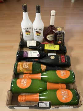 Twelve bottles of alcohol including Malibu, Remi Martin cognac, Bucks Fizz (1 box)