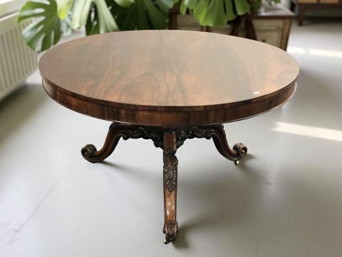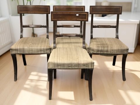 A William IV rosewood circular breakfast table, 129 cm diameter x 74 cm high, together with a set of four mahogany and satinwood-banded dining chairs (5)