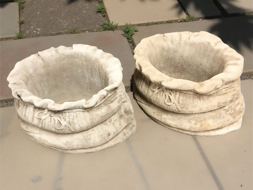 A pair of concrete sack planters, width 45 cm