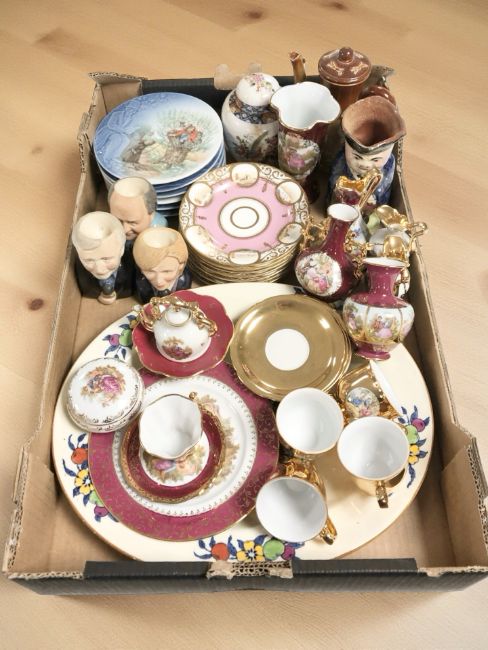 A group of Bing and Grondhal collector's plates, Limoges coffee china, Staffordhire novelty egg cups etc (1 box)