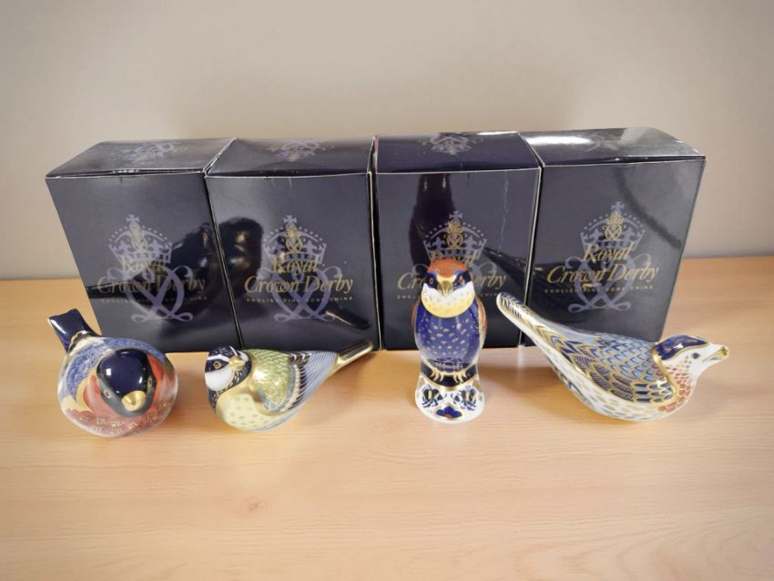 Four Royal Crown Derby porcelain bird paperweights to include bee eater, bullfinch, greattit and bluebird (all with gold stoppers and boxes)