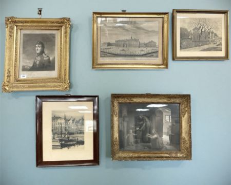 A 19th century monochrome print depicting a military soldier, in ornate frame, 25 cm x 31.5 cm, together with four further antique and later monochrome prints. (5)