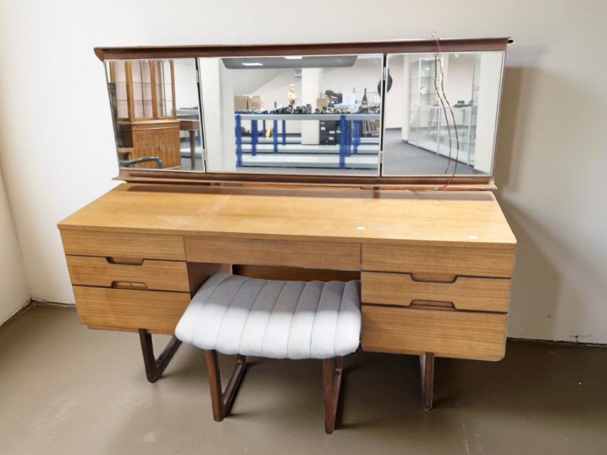 A 20th century teak mirror back dressing table, width 153 cm, with a dressing table stool and a matching six drawer chest, width 122 cm.