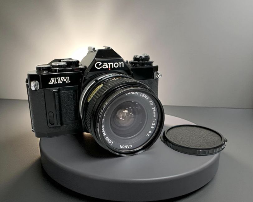 A Canon AV-1 35mm film camera, with Canon FD 28mm 1:2.8 S.C. lens and Astron skylight 55mm lens filter.
