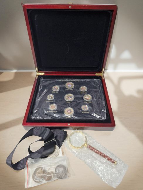 A coin collector's box containing an enameled Elizabeth II pre-decimal coin set, several Victorian and later silver and copper coins, a Second World War war medal and a magnifying glass.