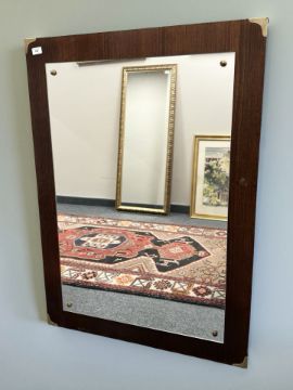 A contemporary mirror on a hardwood board, 78 cm x 109 cm.