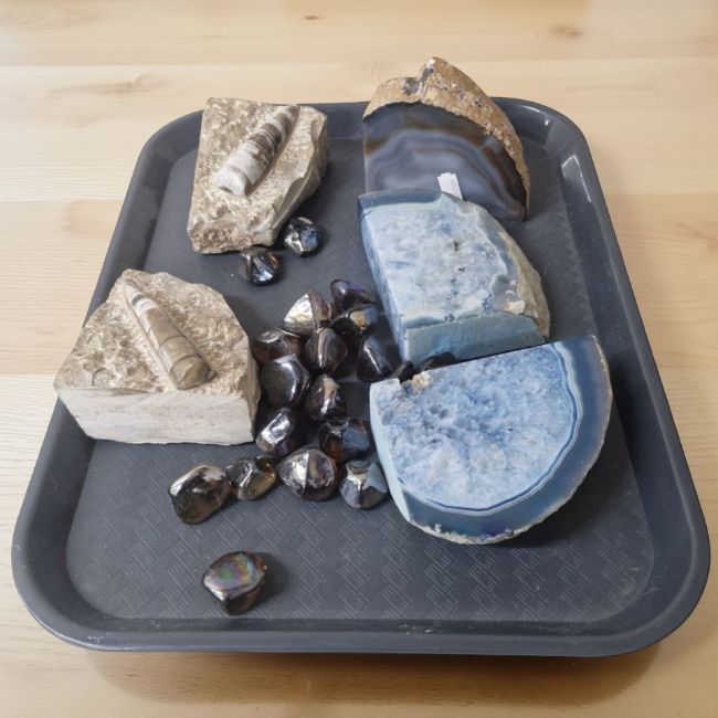 A group of cut and polished gemstone specimens, fossils, iridescent beads.