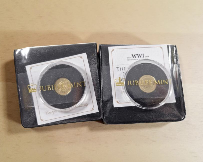 Two Jubilee Mint 9ct gold proof coins, each weighing 1g, from an edition of 9,999, commemorating Prince George's first birthday and the centenary of World War One, with certificates.