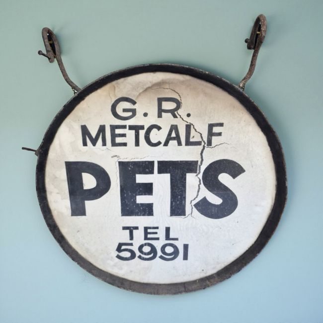 A G. R. Metcalf double-sided pet shop hanging street sign, diameter 46 cm. *Provenance - Preston Park Museum and Stockton-on-Tees Borough Council