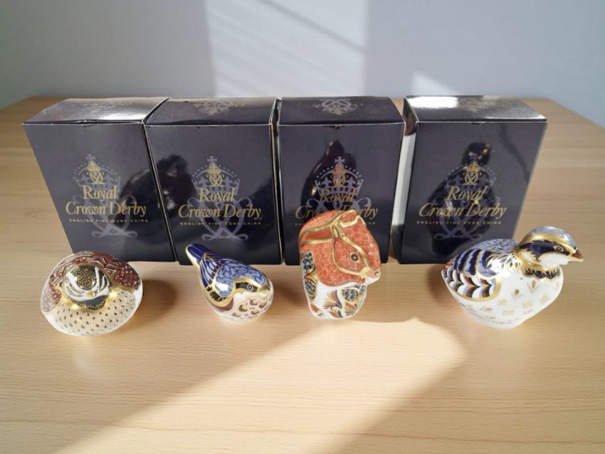Three Royal Crown Derby porcelain bird paperweights to include redlegged partridge, nuthatch, and dappled quail, together with a red squirrel. (all with gold stoppers, boxed)