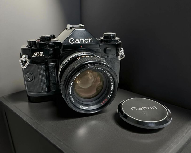 A Canon A-1 35mm film camera, with Canon FD 50mm 1:1.4 S.S.C lens.
