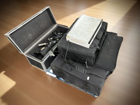 A photographic studio lighting set up to include Colortram spot light, Visatec Solo 3200B lamps, Elinchrom flash system with 202 unit, Various cables, tripods, reflectors and a hydraulic Foba studio stand.