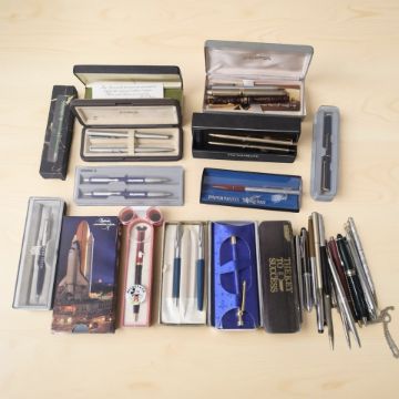 Various ballpoint pens including Parker, Sheaffer, a novelty Mickey Mouse example, etc.