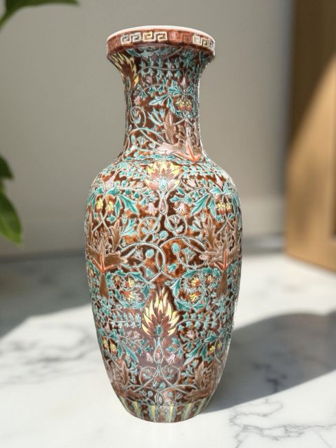 A Chinese porcelain baluster vase decorated with honeysuckle on rust ground, height 31 cm.