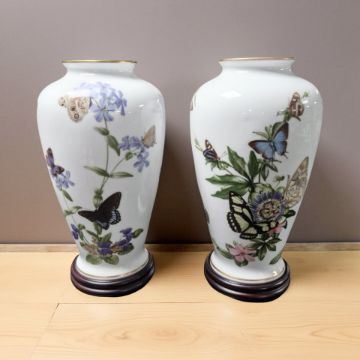 A pair of Franklin porcelain butterfly vases designed by John Wilkinson, on turned wooden stands, height 30 cm.