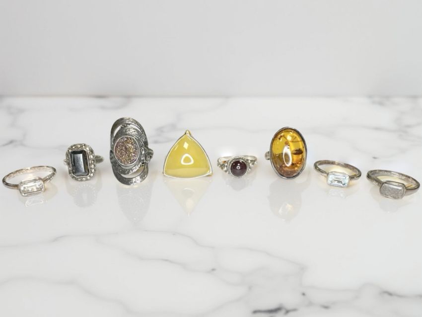 Eight silver/white metal dress rings, set with topaz, amber, etc