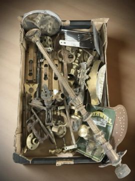 A quantity of antique door furniture, ceiling light fixture, chrome shaving mirror, brass wares, etc. (1 box)