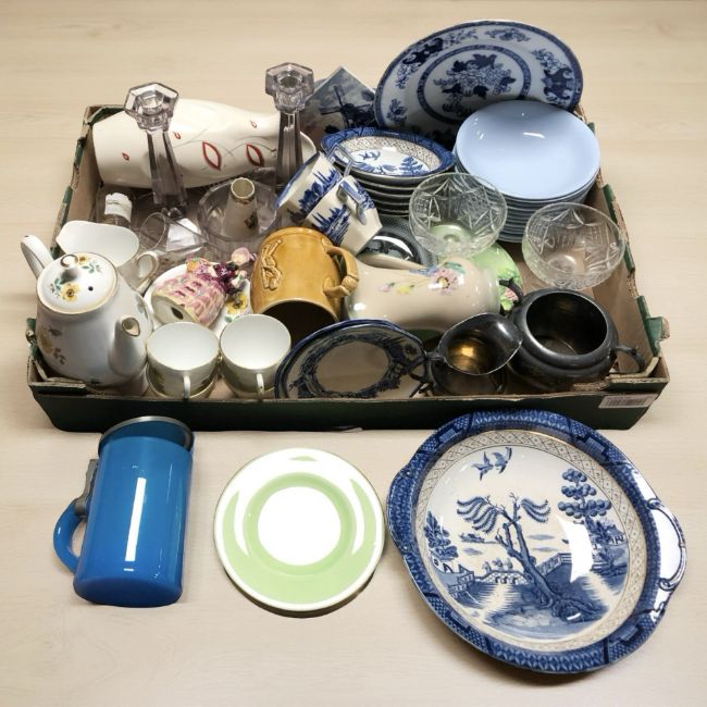 Assorted ceramics including tea china, blue and white items, Delft tiles, a pair of Art Deco glass candlesticks, EPNS wares, etc. (1 box)