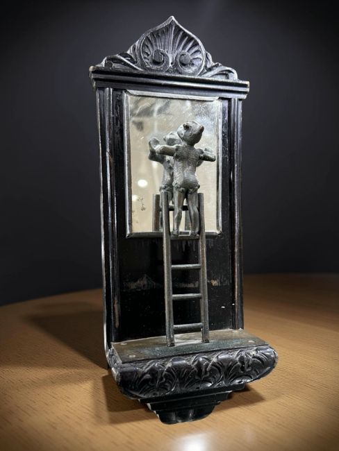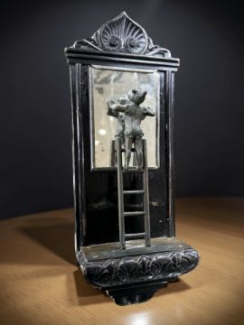 A 19th century carved and ebonised wall mirror surmounted by a figure standing on a ladder, length 27 cm