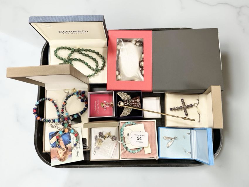 Assorted costume jewellery including silver items, earrings, decorative candle snuffer, etc (one tray)