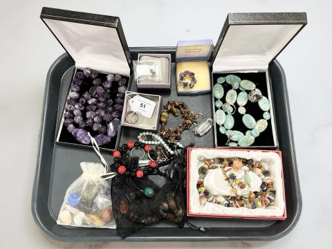 Assorted costume jewellery including hardstone bead necklaces, loose beads, large amethyst necklace, etc (one tray)
