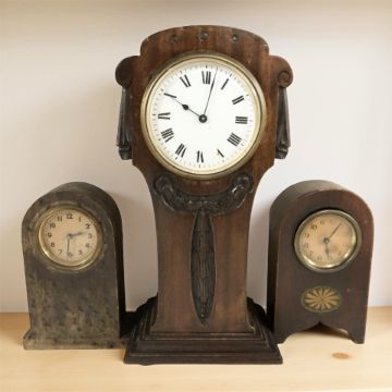 An Art Nouveau mahogany mantel clock, height 28 cm, and two further clocks.