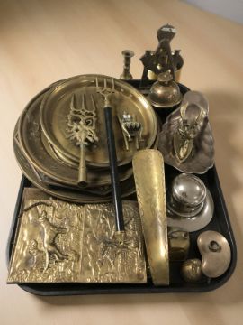 Metalwares including brass plaques and chargers, Indian enameled brass temple bell, Masonic desk stand, Stag door knocker, etc.