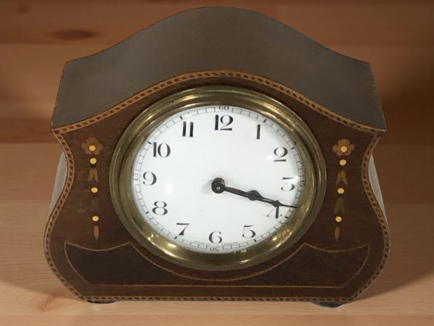 A French Art Nouveau mahogany and satinwood inlaid mantel clock, width 17 cm.