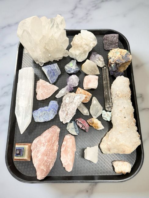 A collection of geology specimens, polished pyramid etc (one tray)