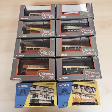 Eight Corgi Original Omnibus 1:76 scale die cast buses and two further Corgi Classics trams. (all boxed)