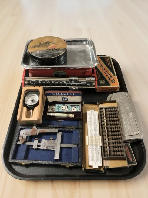 A set of West German enameled scales, a small abacus, slide rule, safety razors, Japanese lacquer circular trinket box.