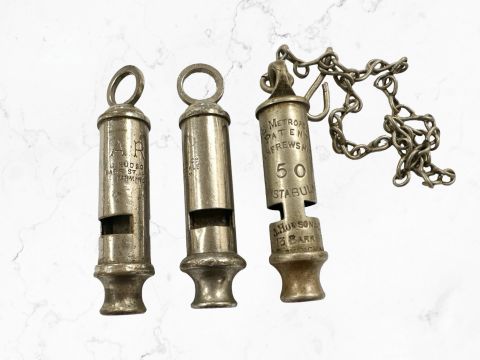 Two vintage ARP whistles together with a Metropolitan police whistle