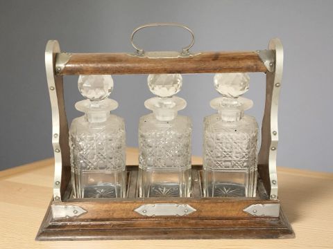 A Victorian oak and silver plate three bottle tantalus, width 39 cm. (no key)