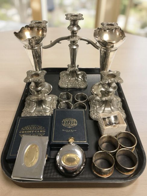An EPNS three branch candelabrum and matching pair of squat candlesticks, a pair of bud vases, various napkin rings, a Grants of Dalvey voyager clock and a further credit card case, both boxed.