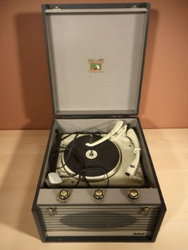 A vintage HMV portable record player.